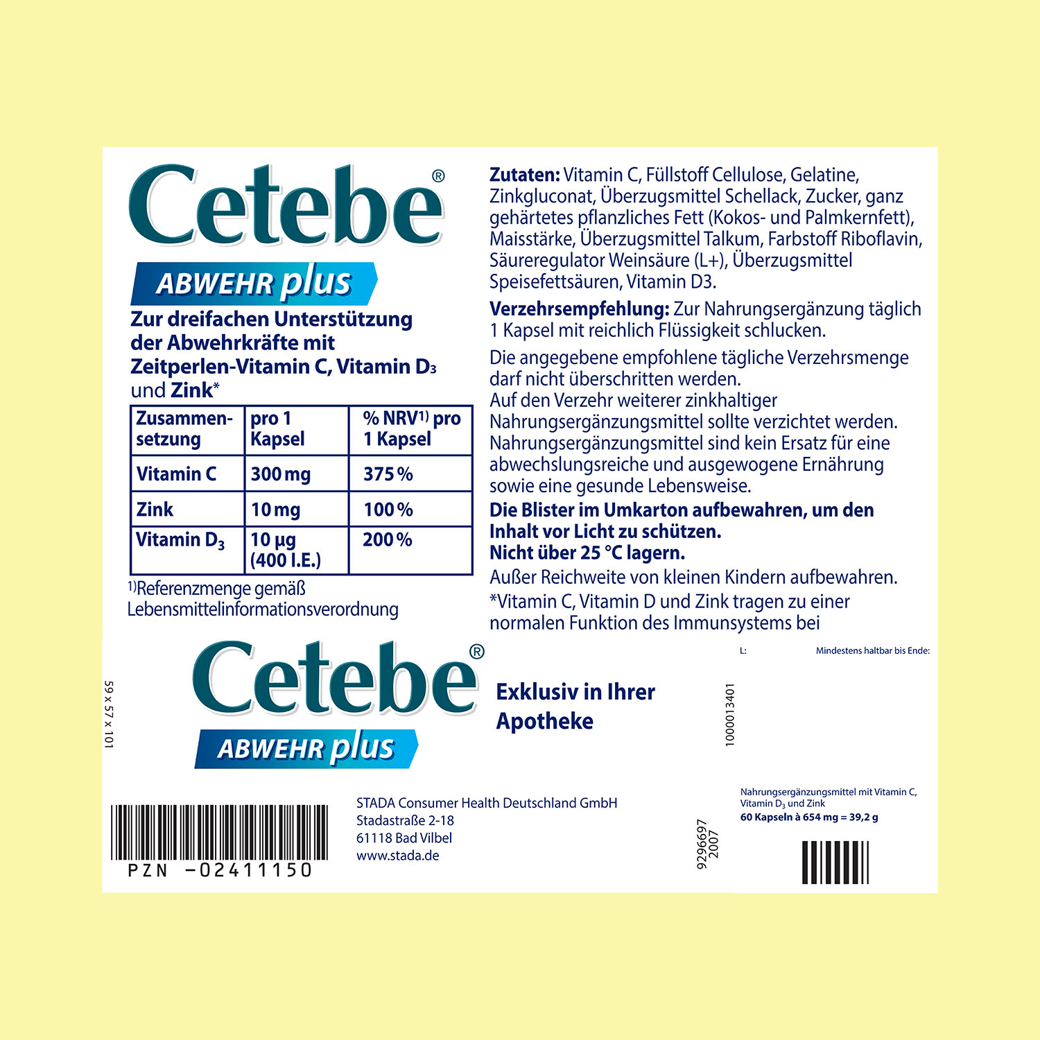 Nahrungsergänzungsmittel mit Vitamin C, Zink und Vitamin D3. Cetebe® ABWEHR plus unterstützt mit Hilfe der wichtigen Nährstoffe Vitamin C, Vitamin D und Zink die Abwehrkräfte und trägt zu einer normalen Funktion des Immunsystems bei.** Vitamin C, Vitamin D und Zink sind an unterschiedlichen Prozessen im Immunsystem beteiligt.