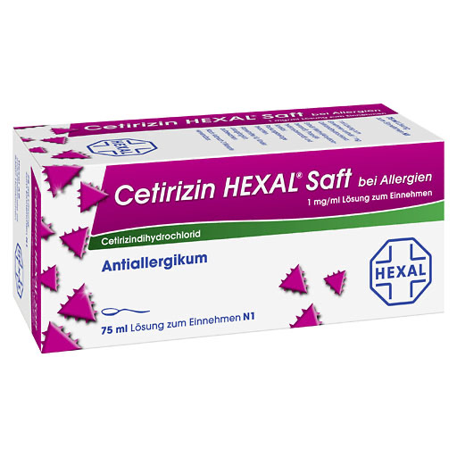 Cetirizin HEXAL® Saft bei Allergien, 1 mg/ml Lösung zum Einnehmen/- Tropfen bei Allergien, 10 mg/ml Tropfen zum Einnehmen, Lösung : Wirkstoff: Cetirizindihydrochlorid. Anwendungsgebiete: Bei Erwachsenen und Kindern ab einem Alter von 2 Jahren zur Linderung von Nasen- und Augensymptomen bei saisonaler und ganzjähriger allergischer Rhinitis sowie zur Linderung von Nesselsucht (Urtikaria). Saft: Enthält Methyl(4-hydroxybenzoat) und Propyl(4-hydroxybenzoat).