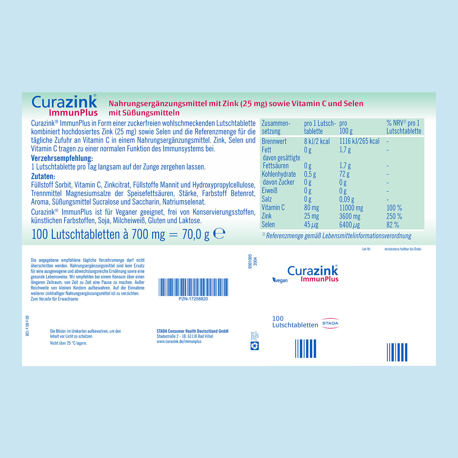 Die essenziellen Spurenelemente Zink, Selen und Vitamin C spielen unter anderem für die normale Funktion des Immunsystems eine wichtige Rolle. Curazink® ImmunPlus kombiniert in einer leicht einzunehmenden, fruchtig-frisch schmeckenden Lutschtablette hochdosiertes Zink (25 mg) mit Selen und der empfohlenen Tagesdosierung an Vitamin C. So leistet Curazink® ImmunPlus einen wertvollen Beitrag zur Ergänzung Ihrer täglichen Ernährung und zur Unterstützung der normalen Funktion ihres Immunsystems.
