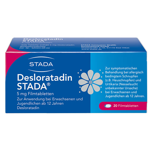 Anwendungsgebiete: Desloratadin STADA® bessert die Symptome bei allergischer Rhinitis (durch eine Allergie hervorgerufene Entzündung der Nasengänge, beispielsweise Heuschnupfen oder Hausstaubmilben-Allergie). Diese Symptome beinhalten Niesen, laufende oder juckende Nase, Juckreiz am Gaumen und juckende, gerötete oder tränende Augen. Es wird ebenfalls angewendet zur Besserung der Symptome bei Urtikaria (ein durch eine Allergie hervorgerufener Hautzustand). Diese Symptome beinhalten Juckreiz und Quaddeln. Die Besserung dieser Symptome hält einen ganzen Tag an und hilft Ihnen, Ihre normalen Alltagsaktivitäten wieder aufzunehmen und Ihren Schlaf wiederzufinden. Wenn Sie sich nach 10 Tagen nicht besser oder gar schlechter fühlen, wenden Sie sich an Ihren Arzt.