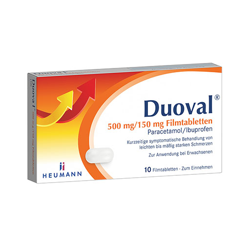 Anwendungsgebiete: Duoval wird zur kurzzeitigen symptomatischen Behandlung von leichten bis mäßig starken Schmerzen angewendet. Duoval ist speziell anwendbar bei Schmerzen, die durch alleinige Anwendung von Ibuprofen oder Paracetamol nicht gelindert werden können. Warnhinweise: Arzneimittel für Kinder unzugänglich aufbewahren. Bei Schmerzen oder Fieber ohne ärztlichen Rat nicht länger anwenden als in der Packungsbeilage vorgegeben! Enthält Lactose.