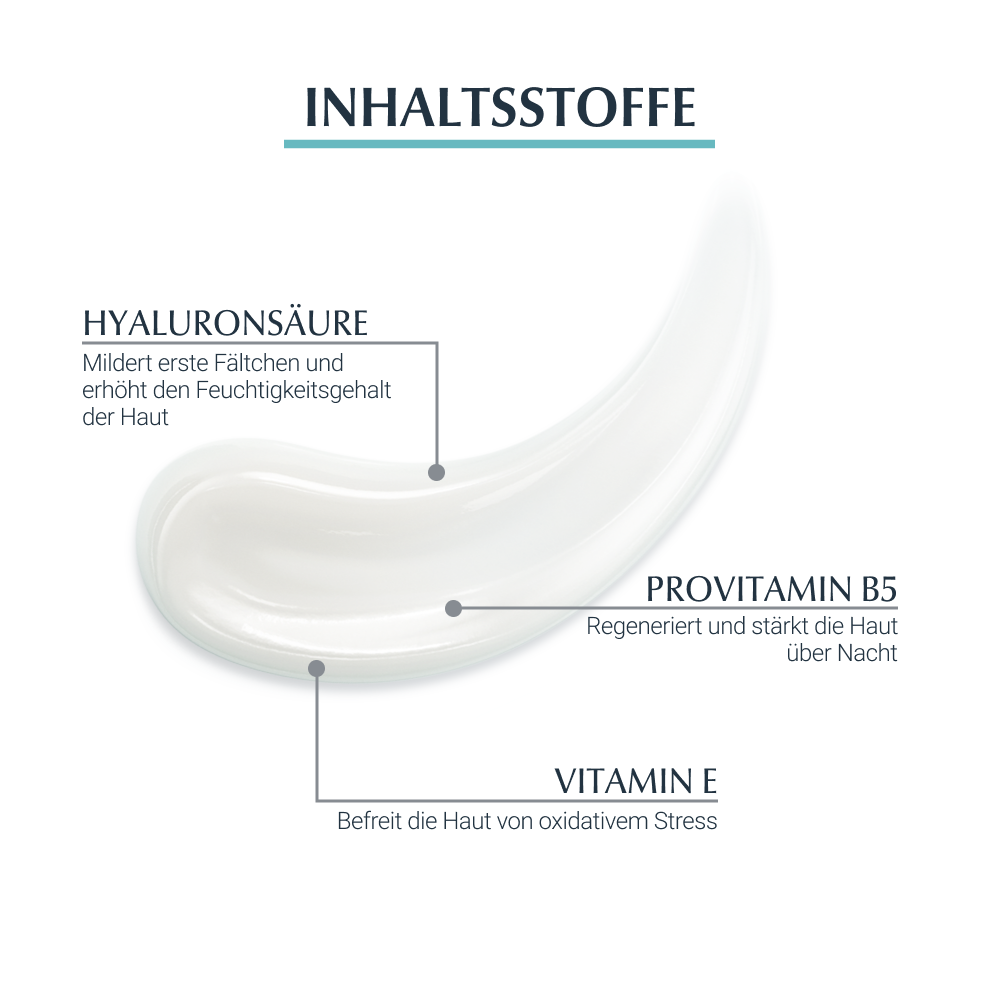 Zusätzlich regeneriert und stärkt Provitamin B5 in der Hyaluroncreme die Haut über Nacht und Vitamin E befreit die Gesichtshaut von oxidativem Stress.