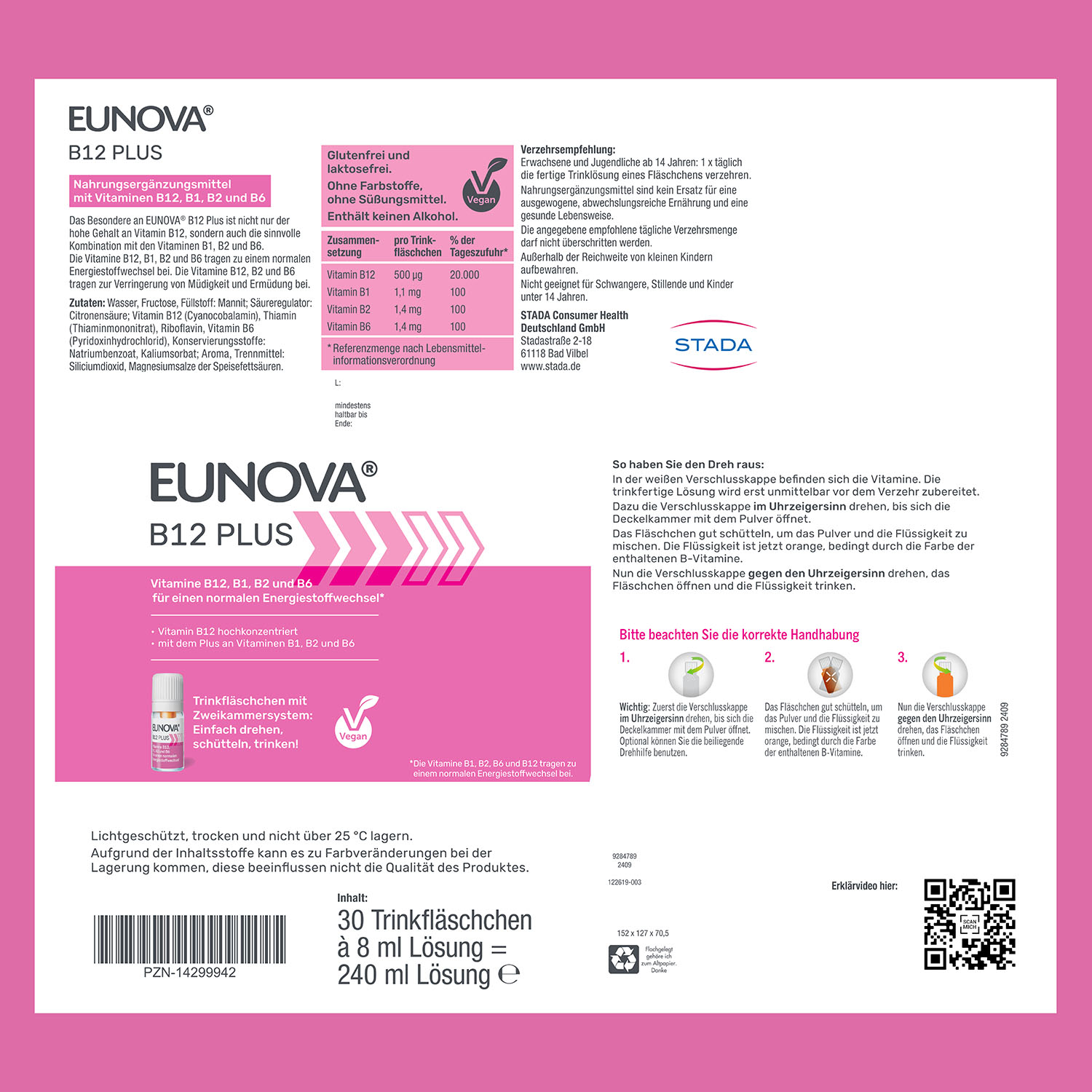 EUNOVA® B12 Plus: Es enthält hochdosiertes Vitamin B12 (500 μg) in einer sinnvollen Kombination mit den B-Vitaminen B1, B2 und B6. Diese tragen zur Verringerung von Müdigkeit und Ermüdung und die Vitamine B12, B1, B2 und B6 zu einem normalen Energiestoffwechsel bei.