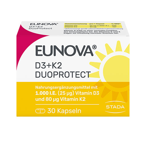 Die Kombination von Vitamin D3 mit Vitamin K in einem Präparat ist im Hinblick auf die Ernährungsphysiologie sinnvoll. EUNOVA® DuoProtect D3 + K2 hilft Ihnen, die täglich empfehlenswerte Menge an Vitamin D und Vitamin K ganz bequem einzunehmen.