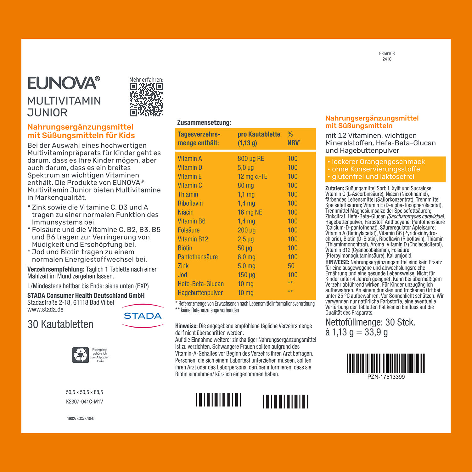 EUNOVA® Junior Kautabletten versorgen Kinder ab 4 Jahren mit 12 Vitaminen und wichtigen Mineralstoffen. Die lecker nach Orange schmeckenden Kautabletten sind frei von künstlichen Farb- und Konservierungsstoffen.