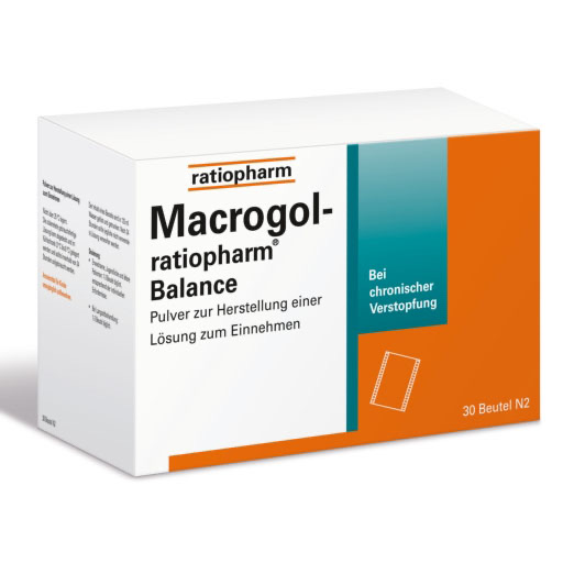 Macrogol-ratiopharm® Balance Pulver zur Herstellung einer Lösung zum Einnehmen Anwendungsgebiete: Chronische Verstopfung. Warnhinweis: Dieses Arzneimittel enthält 0,63 mmol (25 mg) Kalium pro Beutel, 8,1 mmol (187 mg) Natrium pro Beutel und Sorbitol.