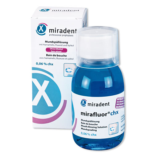 mirafluor chx ist eine gebrauchsfertige Mundspüllösung mit Chlorhexidindigluconat (CHX) zur Unterstützung der täglichen Zahn- und Mundpflege. Unsere Rezeptur wurde um eine leichte Fluoridierung (250 ppm Fluoride) sowie den körpereigenen Zuckeraustauschstoff Xylitol ergänzt. Darüber hinaus enthält die Mundspüllösung Hamamelis, eine aus der indianischen Medizin Nordamerikas bekannte Pflanze. Um bei dem Patienten eine hohe Akzeptanz zu erreichen, wurde bei der Herstellung der Lösung auf den Zusatz von Alkohol verzichtet. mirafluor chx eignet sich besonders zur Vorbeugung gegen Folgeerscheinungen unzureichender Mundhygiene (wie beispielsweise Mundgeruch und Plaque) in nur schwer zugänglichen Mundbereichen.