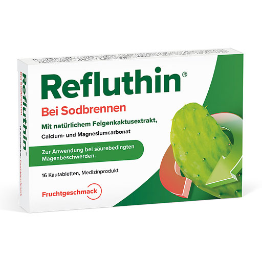 Sodbrennen, saures Aufstoßen oder anhaltender Druck im Magen sind häufige Beschwerden und ziemlich lästig. Sie wünschen sich daher eine rasche und verträgliche Linderung? Die neuen Refluthin® Kautabletten wirken gleich zweifach bei Sodbrennen. Refluthin® Kautabletten sorgen durch mineralische Säurepuffer für eine schnelle, anhaltende und zuverlässige Linderung von säurebedingten Magenbeschwerden. Ihre einzigartige Kombination mit hochkonzentriertem, pflanzlichem Feigenkaktusextrakt bietet außerdem natürlichen Schutz für die angegriffene Schleimhaut der Speiseröhre.