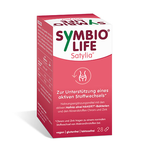 Maisstärke, Überzugsmittel: Hydroxypropylmethylcellulose; gefriergetrocknete Bakterien des Stammes Hafnia alvei HA4597, Zinkbisglycinat, Überzugsmittel: Gellan, Trennmittel: Magnesiumsalze der Speisefettsäuren, Chrompicolinat Symbio Life® Satylia® ist frei von Milch und Sojaeiweiß sowie Gluten.